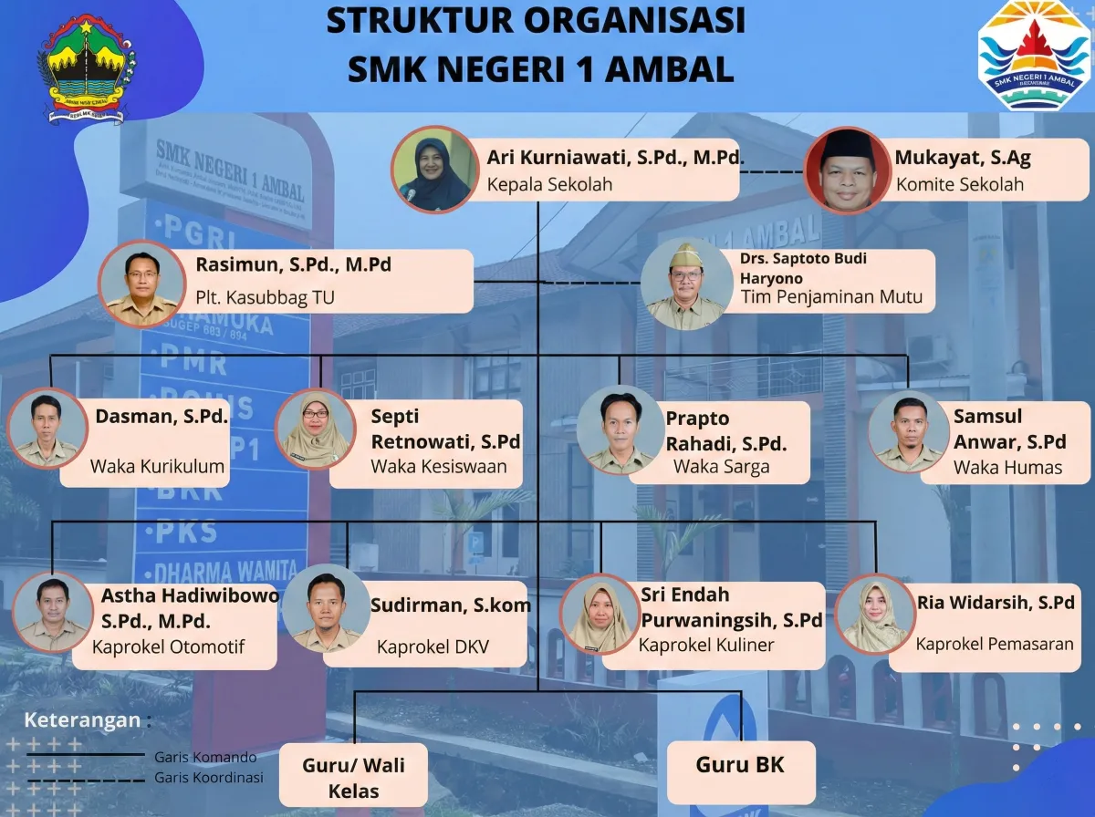 Struktur organisasi SMK Negeri 1 Ambal disusun untuk memastikan penyelenggaraan pendidikan berjalan secara efektif, efisien, dan selaras dengan visi misi institusi.